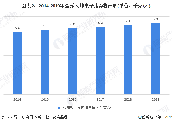 從人均電子廢棄物產(chǎn)量來看,2014-2019年全球人均電子廢棄物產(chǎn)量逐年增加,2019年達到7.3千克/人。